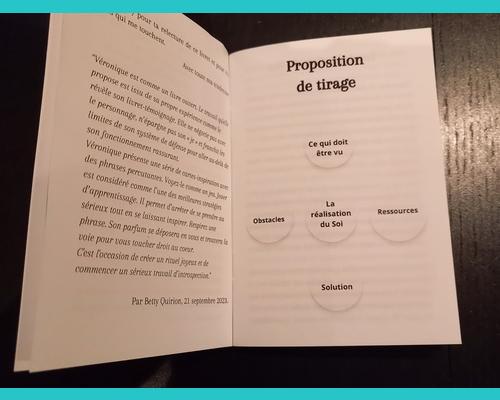 Voici ce que Betty Quirion en dit : "Véronique présente une série de cartes-inspiration avec des phrases percutantes. Voyez-le comme un jeu. Jouer est considéré comme l'une des meilleures stratégies d'apprentissage. Il permet d'arrêter de se prendre au sérieux tout en se laissant inspirer. Respirez une phrase. Son parfum se déposera en vous et trouvera la voie pour vous toucher droit au coeur. C'est l'occasion de créer un rituel joyeux et de commencer un sérieux travail d'introspection."