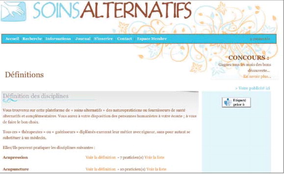 La médecine alternative connaît un succès grandissant: «Il s’explique notamment par la médiatisation de ces méthodes et par l’influence de la culture asiatique que nous connaissons actuellement», explique Corinne Chopard, membre de l’équipe de www.soinsalternatifs.ch et elle-même naturopathe. L’attrait pour le Tibet et pour le bouddhisme justifient donc en partie le regain d’intérêt du public pour la médecine naturelle. Cette demande croissante a conduit Annie Girard et Henri Ruch à créer ce portail internet dans le but de recenser les praticiens par discipline et surtout par région. Il couvre toute la Suisse romande et une partie de la France voisine. Il est exclusivement francophone.